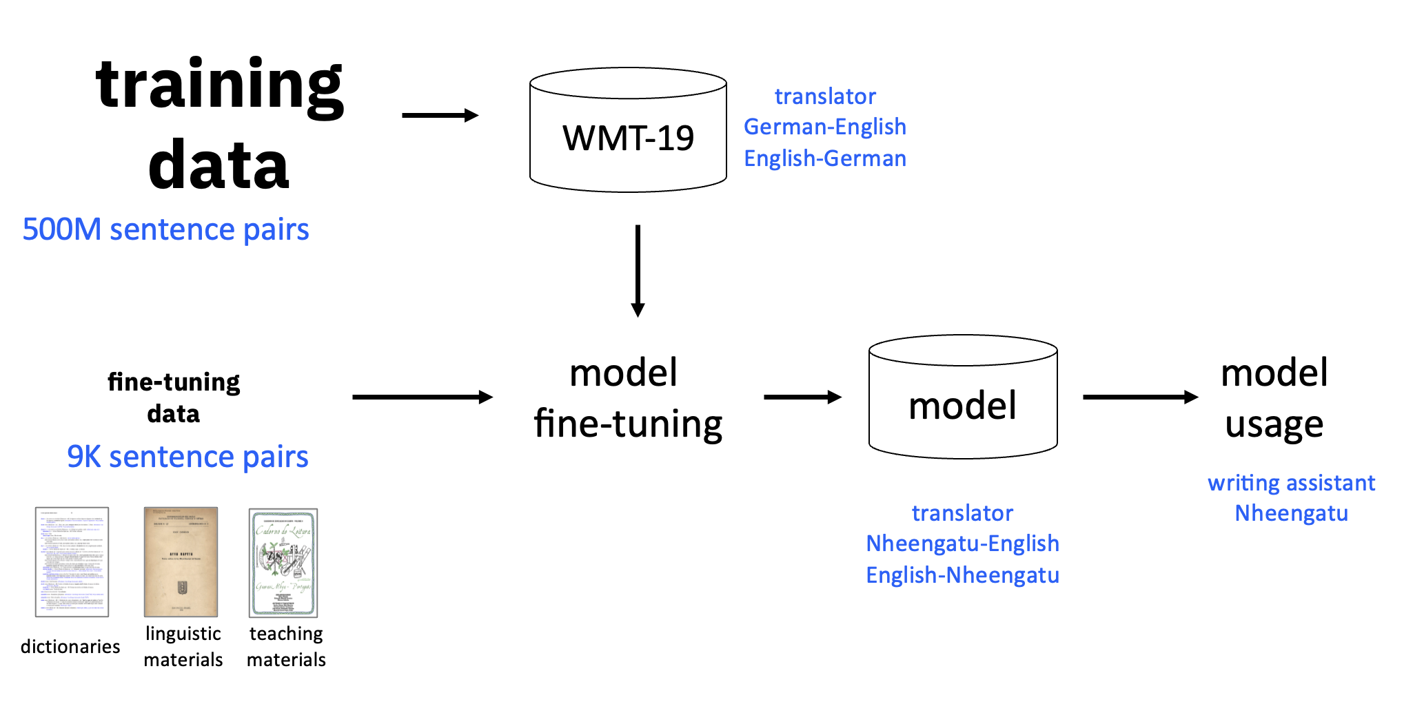 As ferramentas de tradução usadas nos protótipos do Nheengatu foram construídas como resultado da solução de desafios técnicos e do desenvolvimento de soluções para criar tradutores automáticos bilíngues (MTs) para línguas indígenas com base apenas em dados linguísticos disponíveis publicamente, como visto na figura acima.